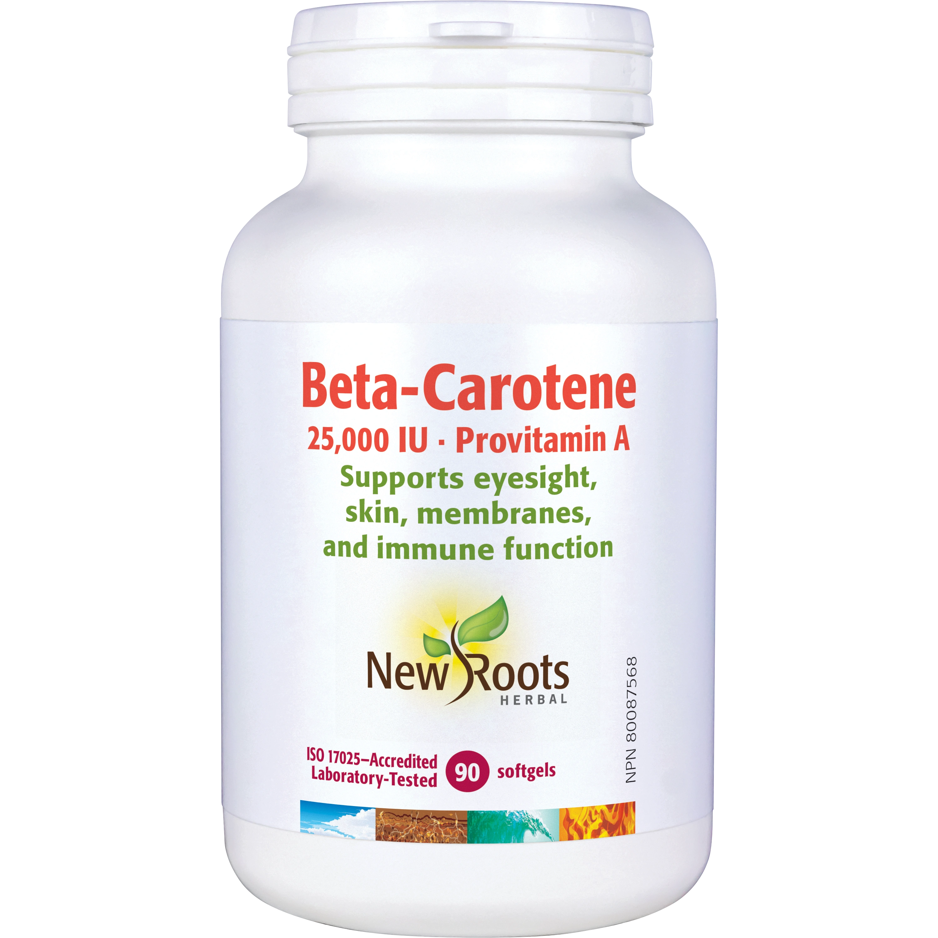 New Roots Herbalâs BetaâCarotene is a naturally occurring form of betaâcarotene with a potency of 25,000 IU per softgel. Sourced from nonâGMO red palm fruit, it also delivers a full spectrum of other beneficial nutrients, including alphaâcarotene, gammaâcarotene, and lycopene.