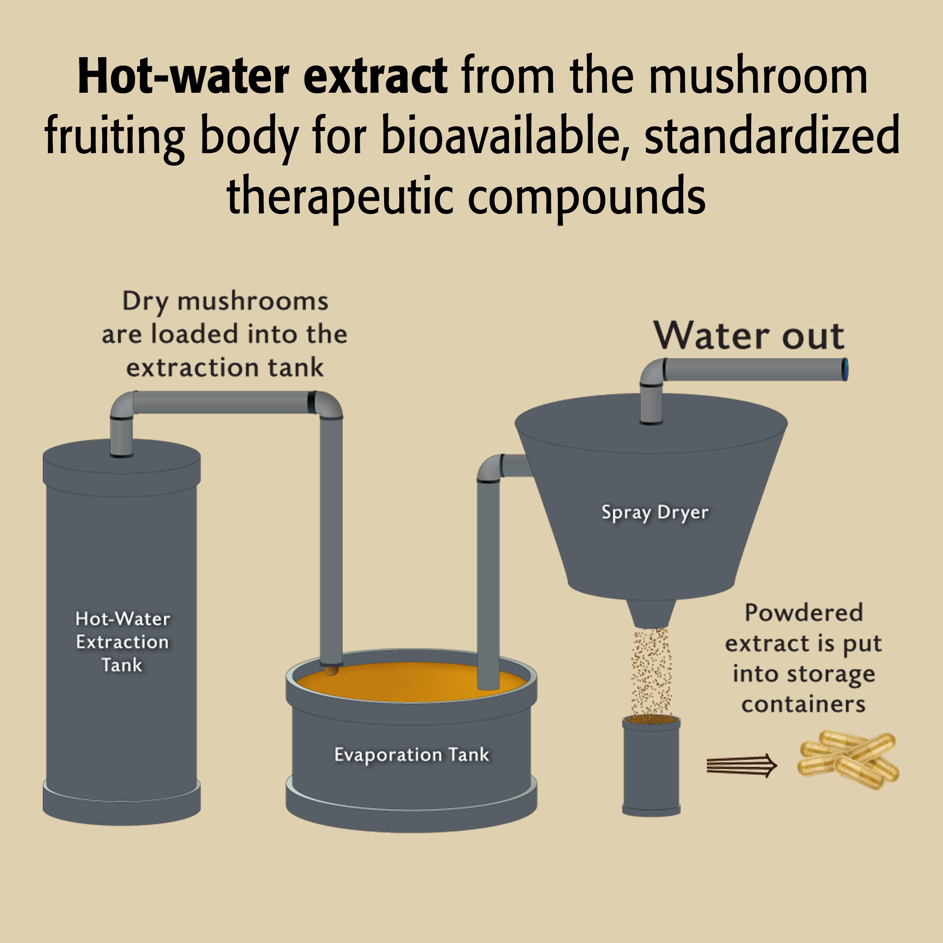 - Hot-water extract allows bioavailabity and absorption of therapeutic polysaccharides and beta-glucans