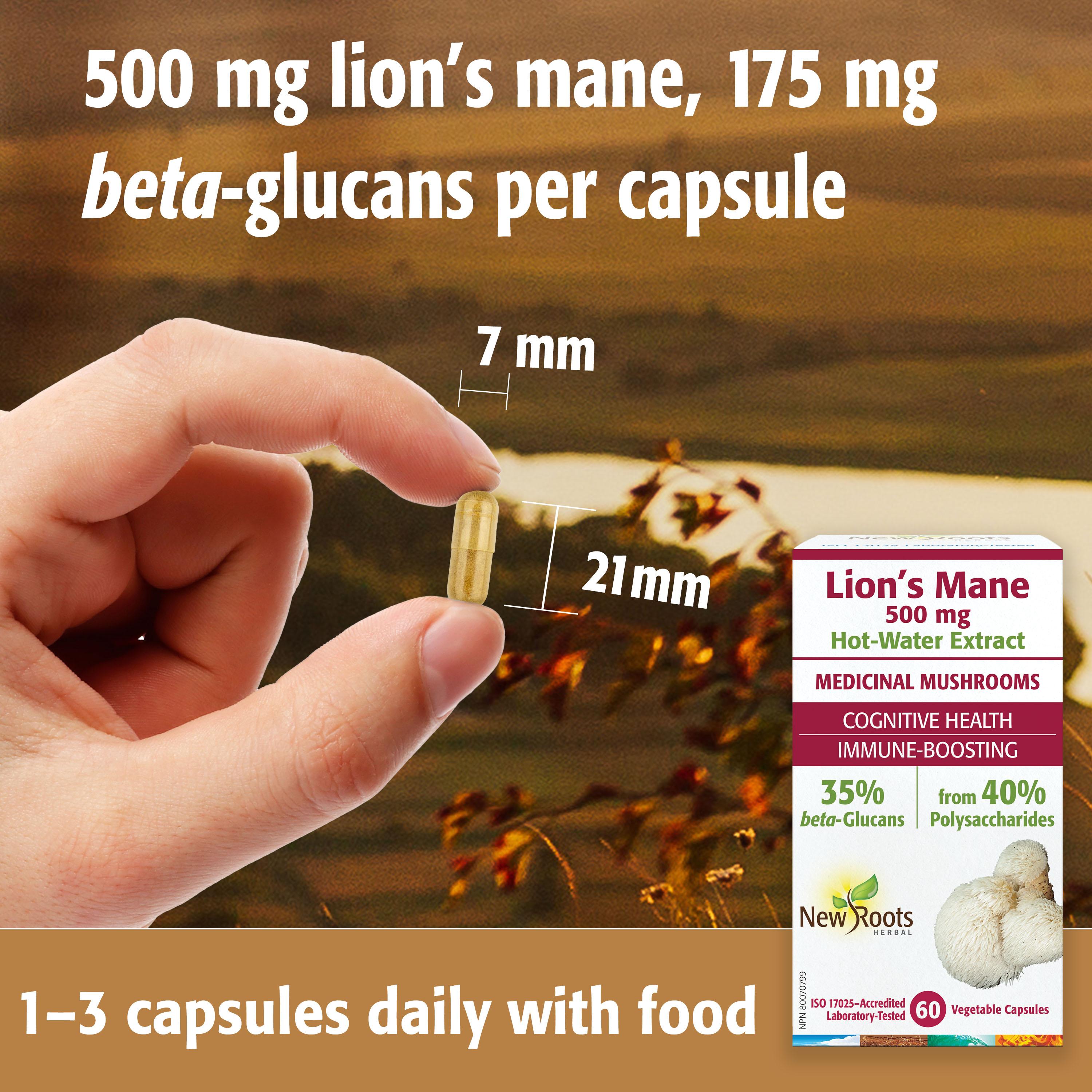 New Roots Herbal’s Lion’s Mane (Hericium erinaceus) is a hot water–extract standardized and potency-validated to contain 40% polysaccharides (500 mg per capsule) with a guaranteed 35% of beta-glucans; clinically researched compounds shown to stimulate immune function and support cognitive health.